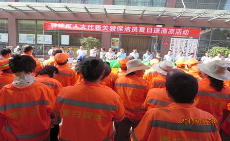 2015年7月28日上午,区委常委邹小刚、区人大副常委史亚鸽、区人大副主任张丽华、区市容局局长等领导、区大代表李冠军、张智锋、绍国希、王新清共同在长乐坊街道办事处门前慰问长乐坊地区保洁员送清凉活动,为默默奉献在长乐坊一线的环卫工人、环保监督员300余名送来盛夏凉爽的问候,长乐坊街道办事处主任赵永强、党工委副书记张亚涛、副主任周兴朝、赵学武、张旭、人大主任魏保华等领导班子成员均出席活动,一起为保洁员送上清凉。各位领导一一把这些防暑降温用品发到保洁员手中,同时叮嘱每一位环卫工人在烈日炎炎的夏日照看好各自身体,做好防护,防暑降温,避免出现中暑等不适情况。