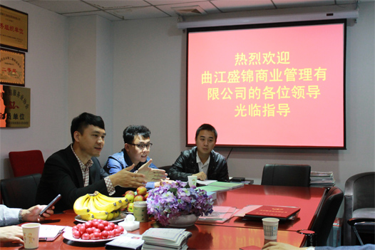 2日曲江盛锦商业管理有限公司的领导来我司指导工作,李总、郭总盛情接待了盛锦公司的各位领导,会上领导们就公司管理问题做了详细的交流,在领导们愉快的交谈中本次会议圆满结束。