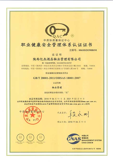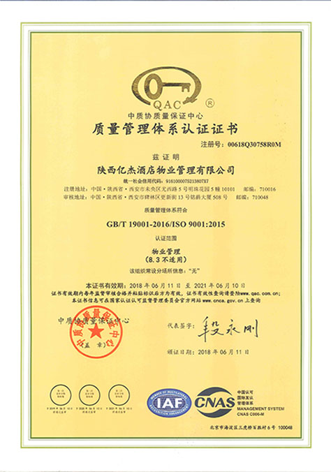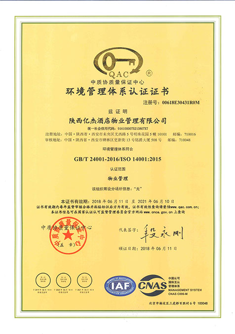 热烈祝贺陕西亿杰酒店物业管理有限公司荣获三体系认证证书